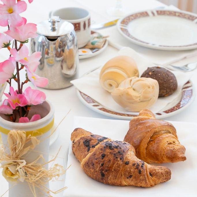 Milch, Fruchtsaft, Joghurt mit verschiedenen Geschmacksrichtungen, Kuchen, Müsli, frisches Obst, Brioches, Körnerbrot, Weißbrot und Milchbrot, Rührei mit Speck, hart gekochte Eier, Marmeladen, Auswahl an Wurst und Käse.